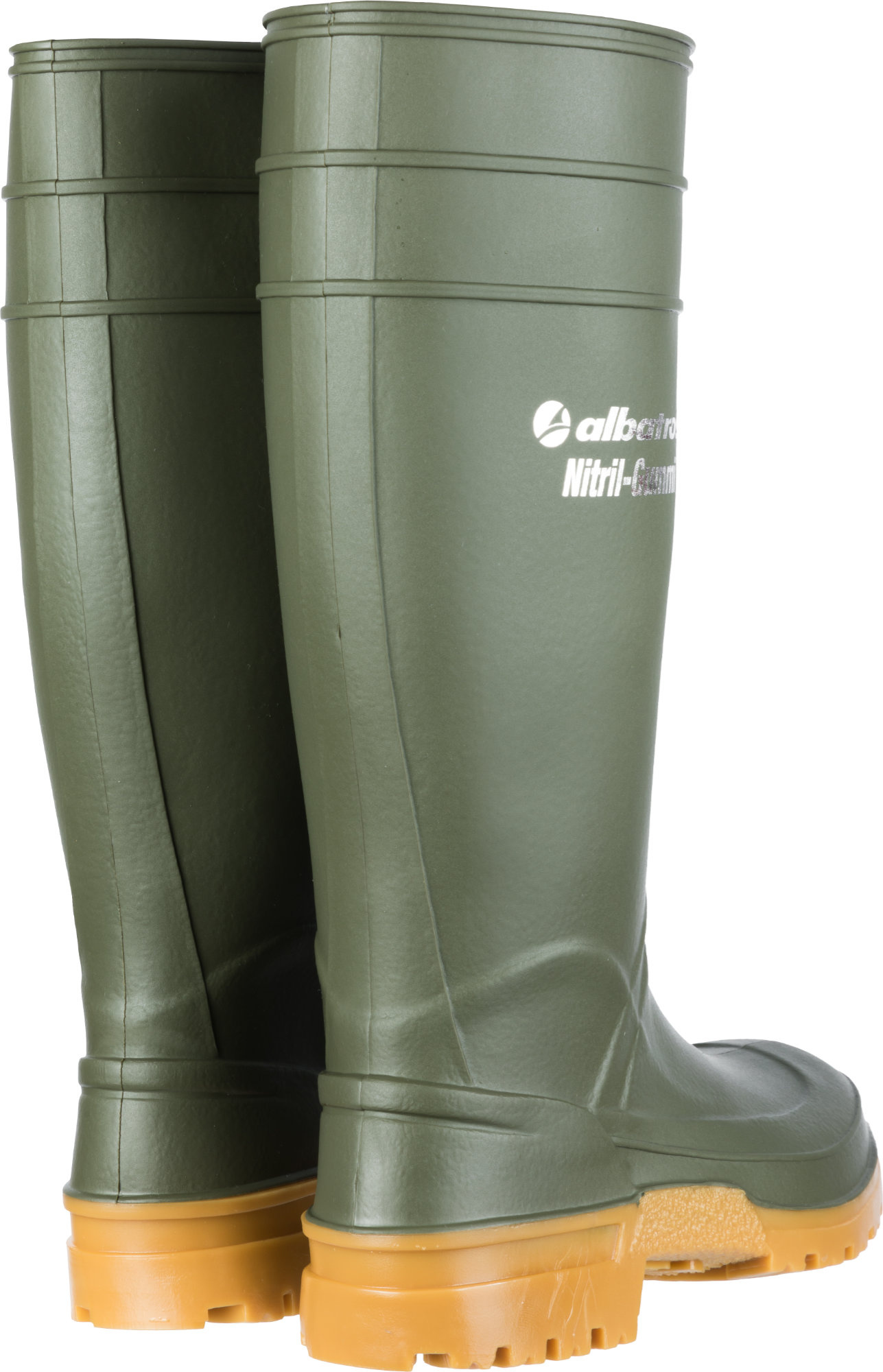 Hoge werklaarzen van Albatros van nitrilrubber, oliebestendig en met antislipzool en anatomisch voetbed. EN ISO 20347. Hoge uitvoering in donkergroene kleur.