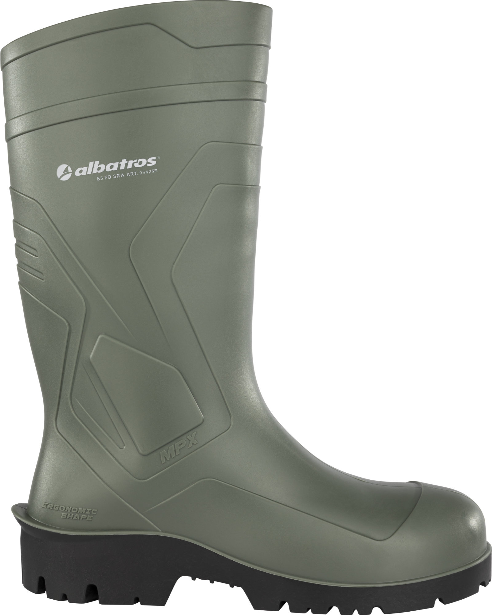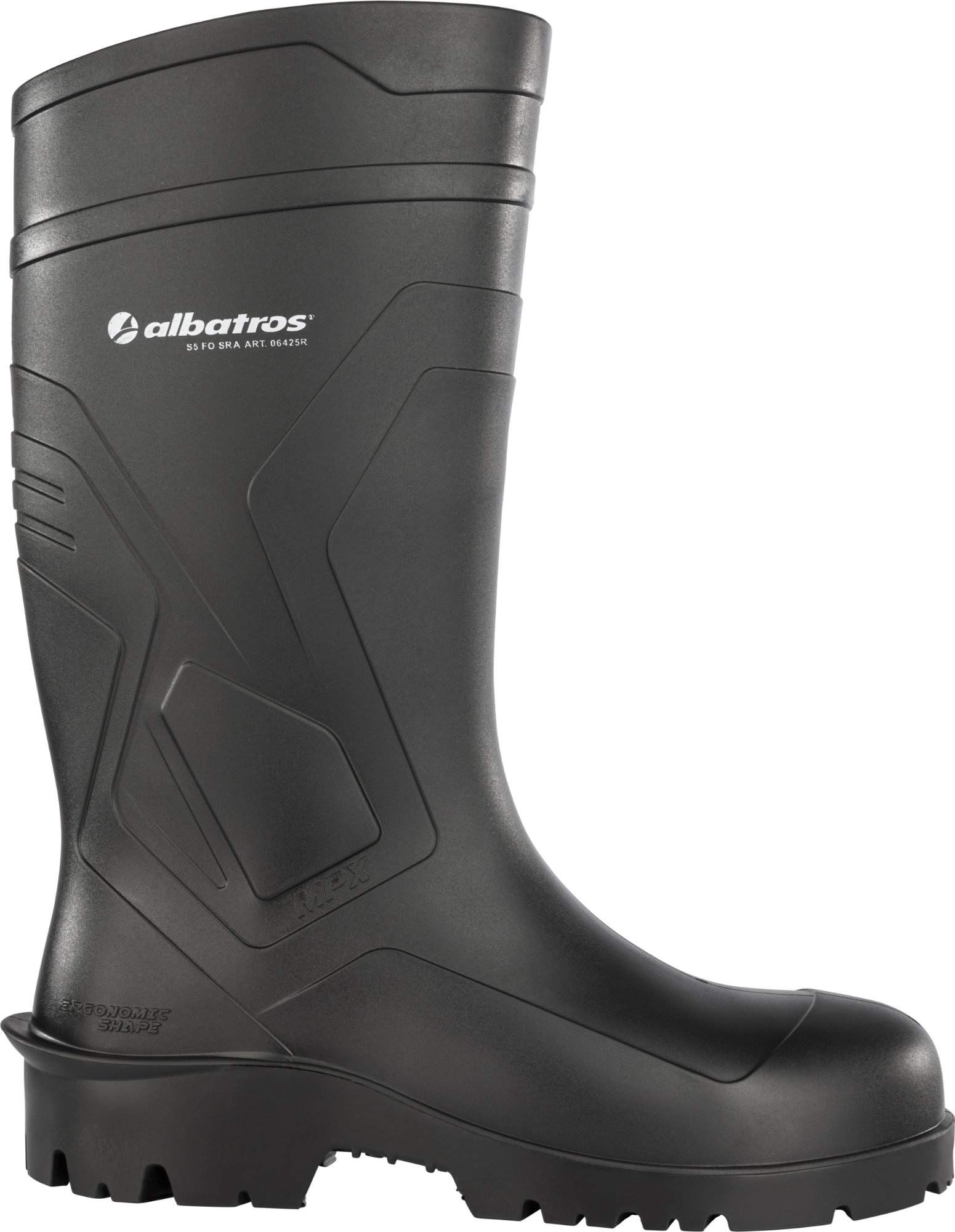 Albatros S5-norm veiligheidslaarzen, model Protector. Volledig waterdicht, met enkelbescherming, antislipzool, stalen neus en antiperforatie tussenzool.