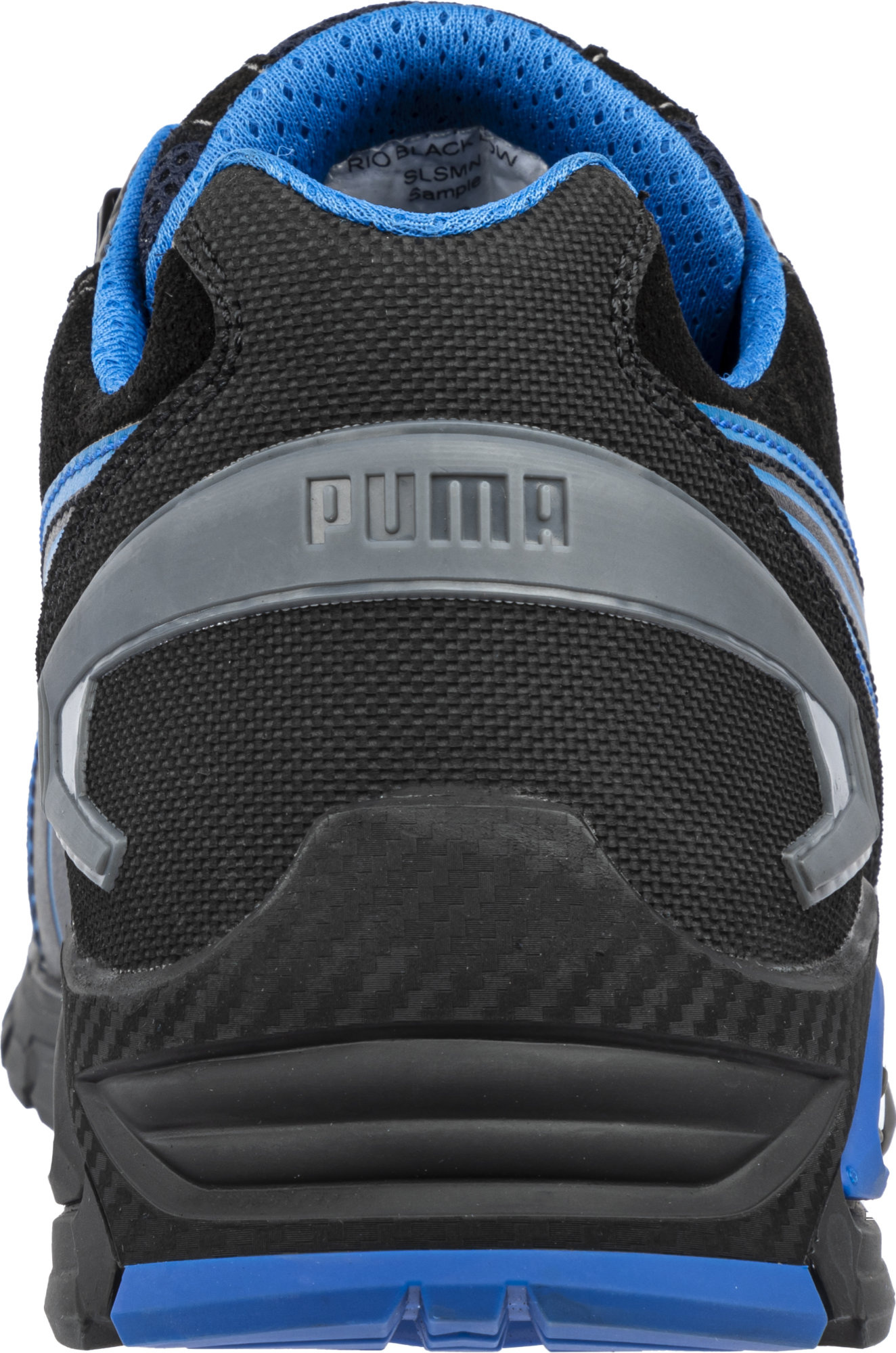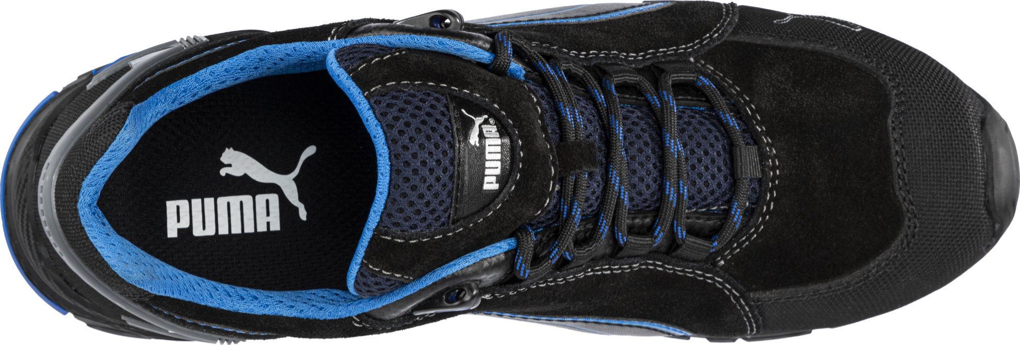 Lage werkschoenen van Puma model 64.275 Rio Black low. Deze zwart met blauwe werkschoenen hebben de SRC en S3 normering.